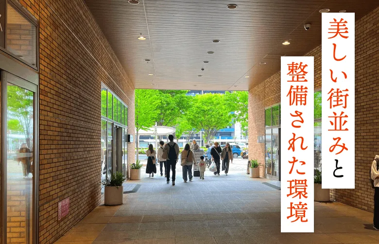 洗練された建物と緑豊かな公園が調和し、清潔感ある街並みが魅力です。道幅も広く車通りが少ないため、安心して過ごせる環境が整っています。 整備された街路や公共スペースが、快適な暮らしを支えます。